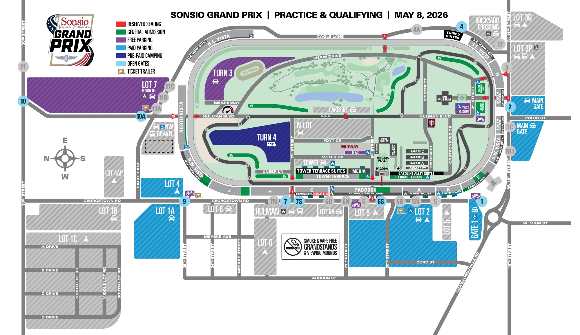 Free parking for practice and qualifications for the Sonsio Grand Prix on Friday, May 8, is available in Lot 7 (North 40). Enter through Gate 10 from 30th Street.