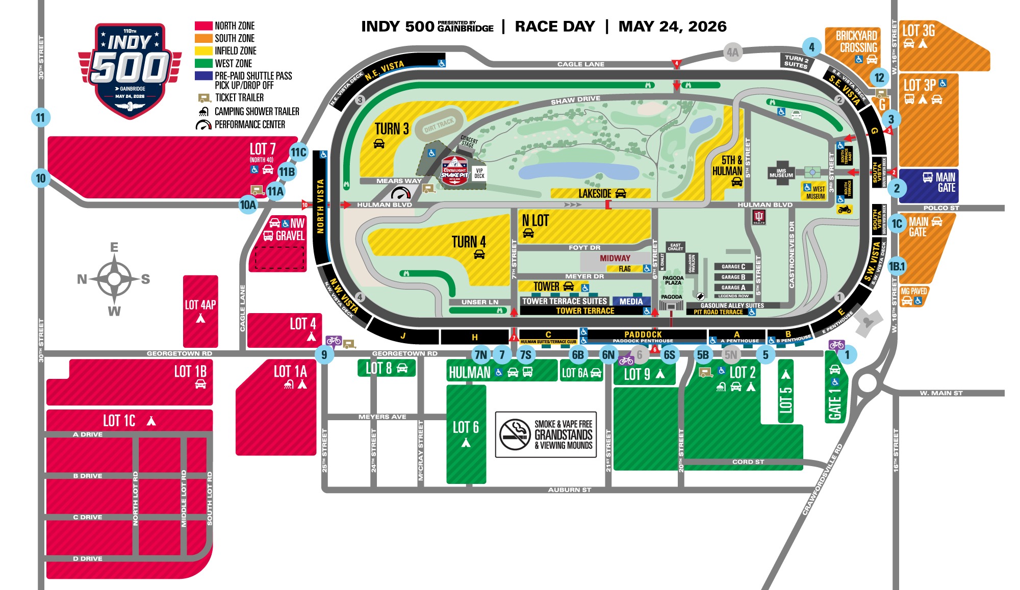 Fans arriving on Thursday, May 21 can stage beginning at 3 p.m. in Lot 1C or the Main Gate Lot (enter via Polco St.). Early entry is not allowed in any IMS camping lots.
