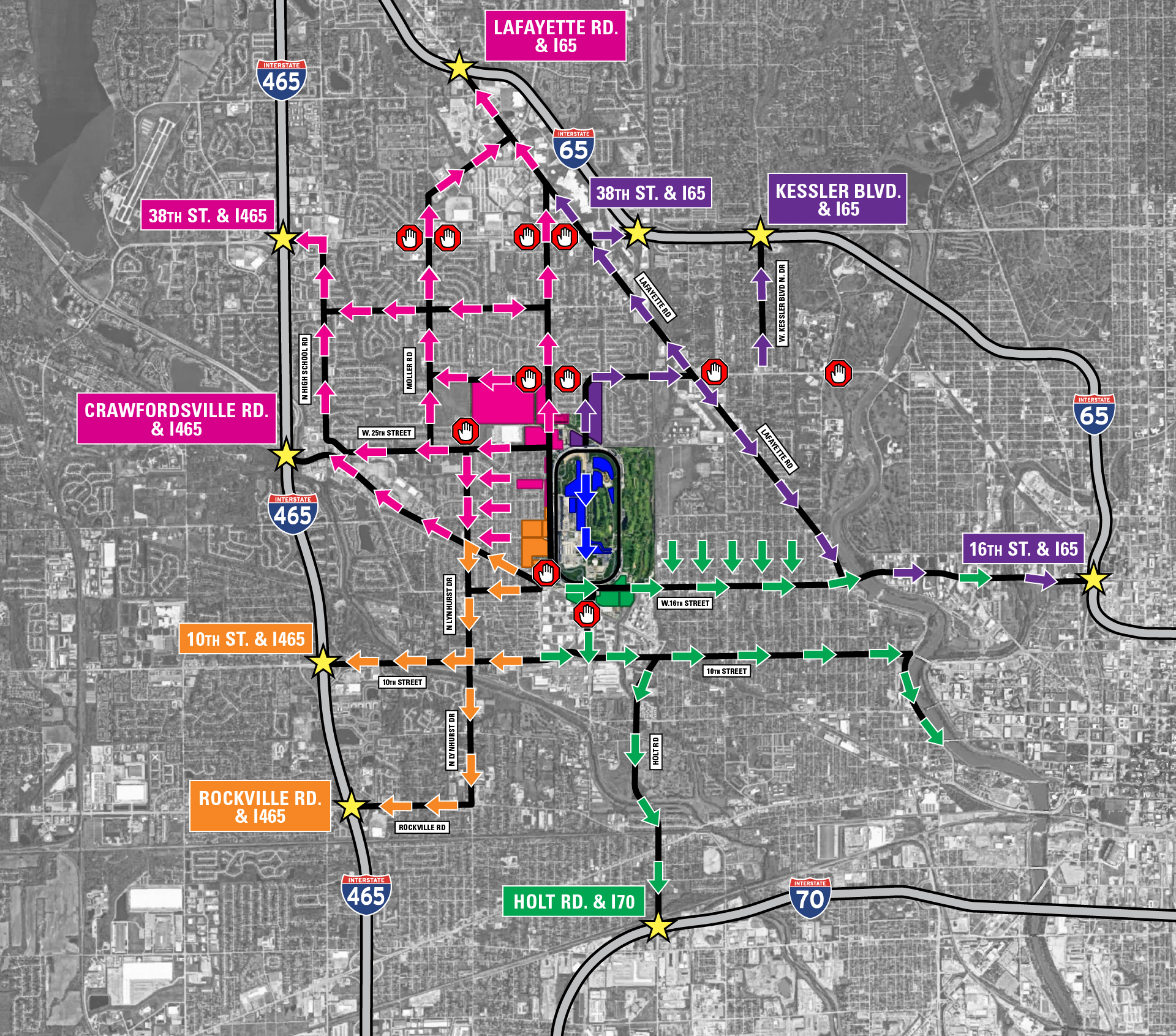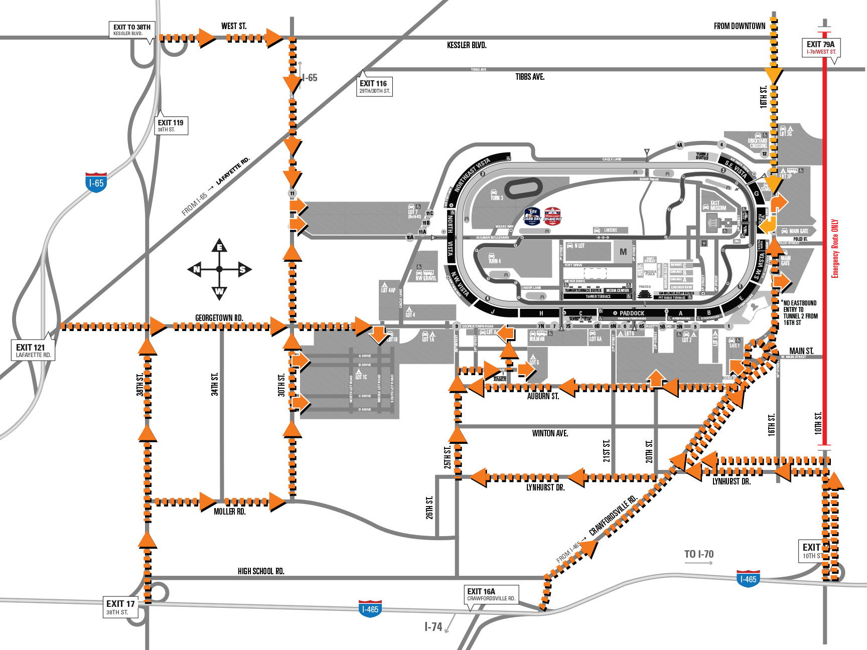 | 5th & Hulman | Enter through Gate 2 from 16th Street. | View Live Traffic |