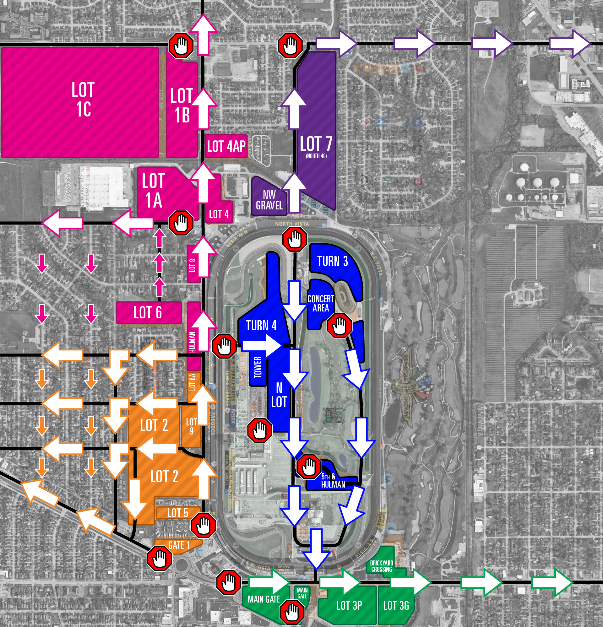 Select your Lot below to see Race Day Lot Specific arrival and departure maps and information.