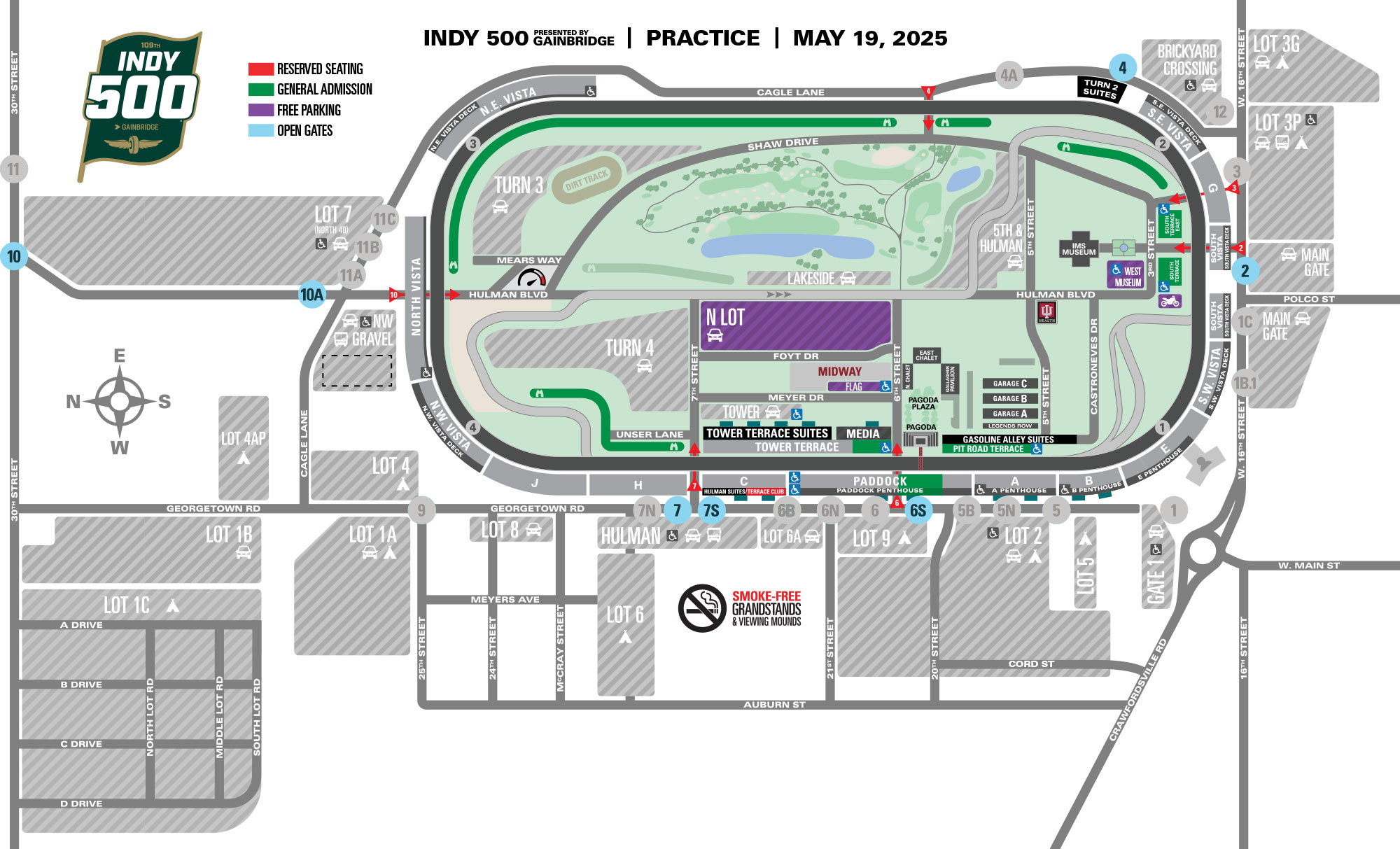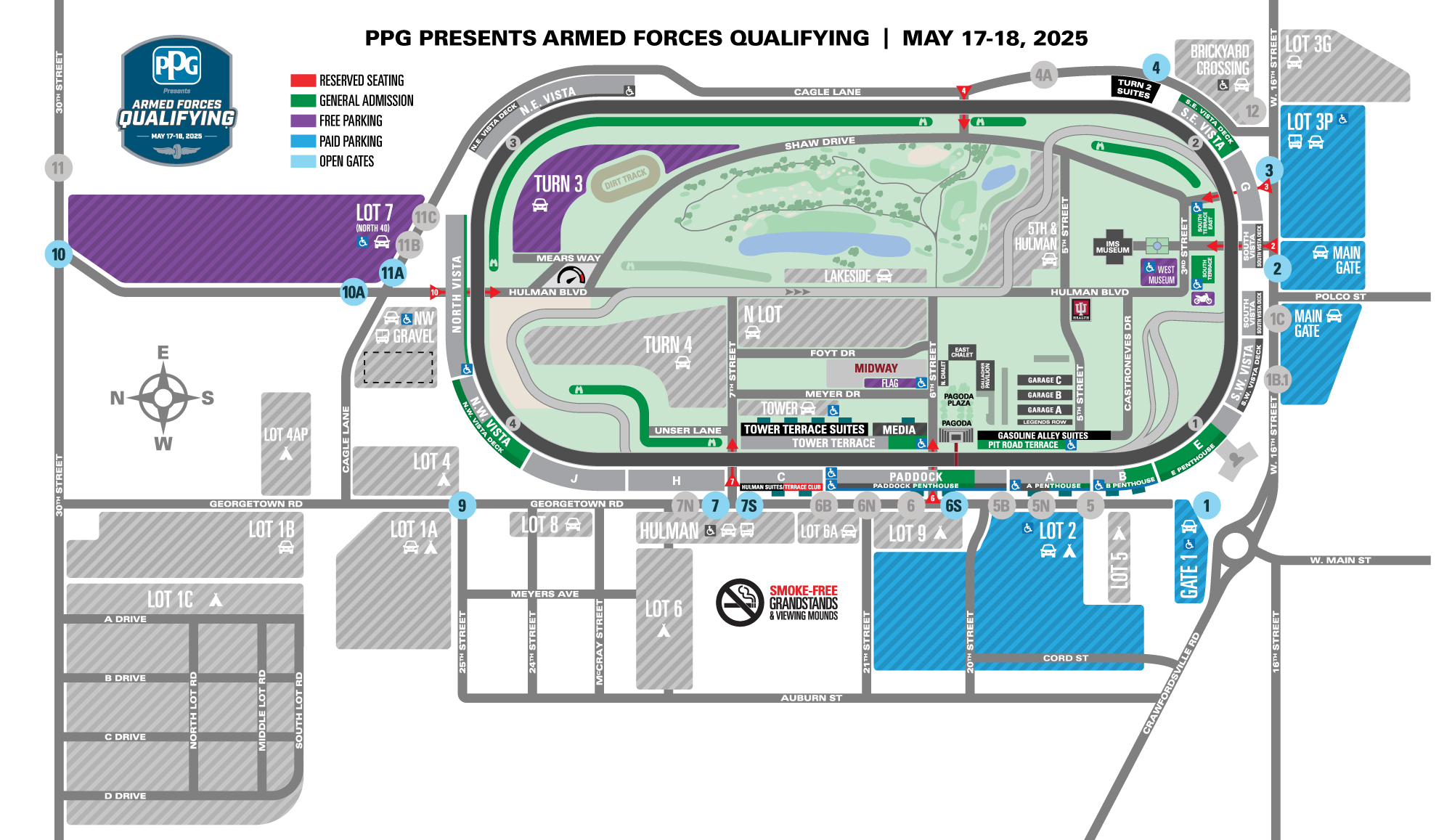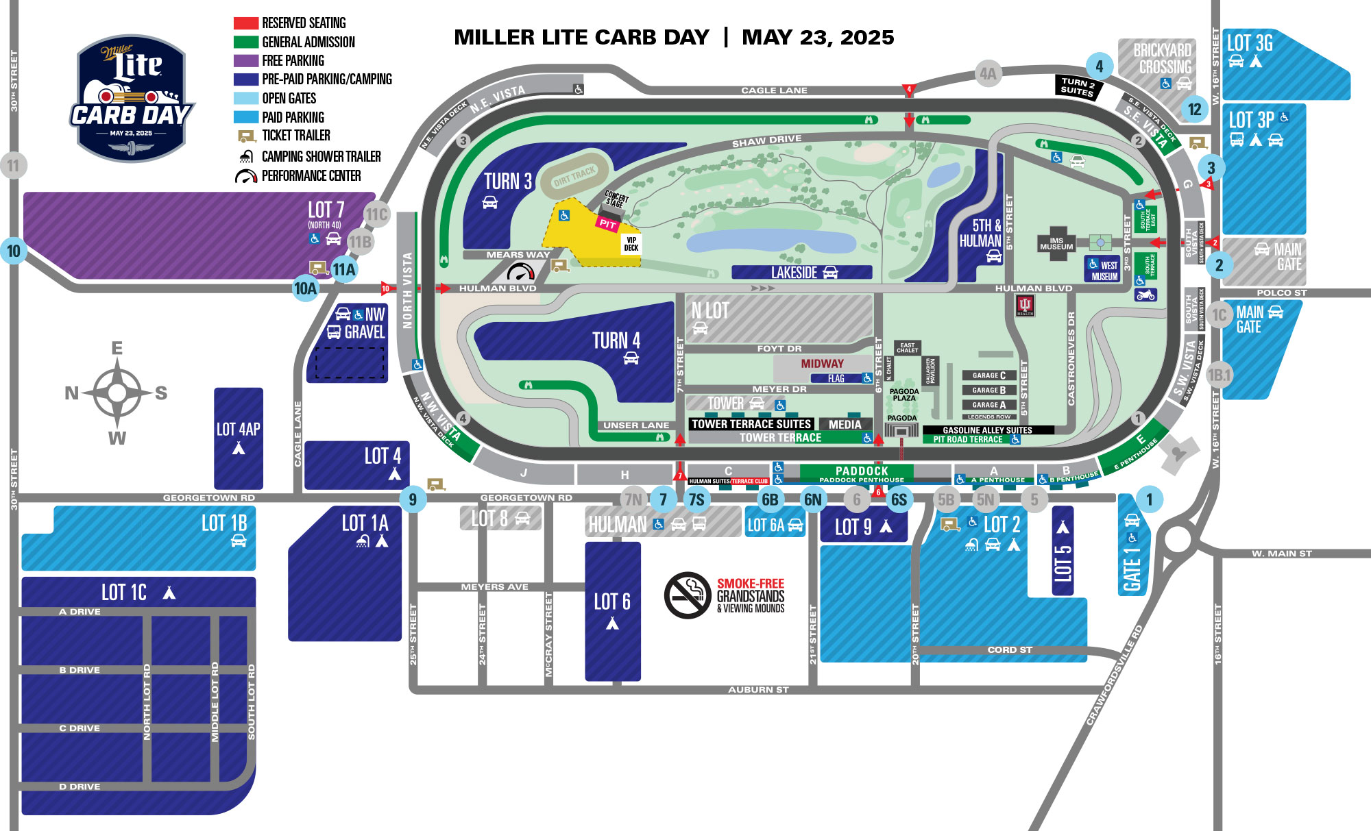 Paid parking will be available at Lot 1B, Lot 2, Lot 3G and Main Gate for $20. Parcel B, located near Gate 1 off of Crawfordsville Road, is available for $75. Free parking is located in Lot 7 (North 40).