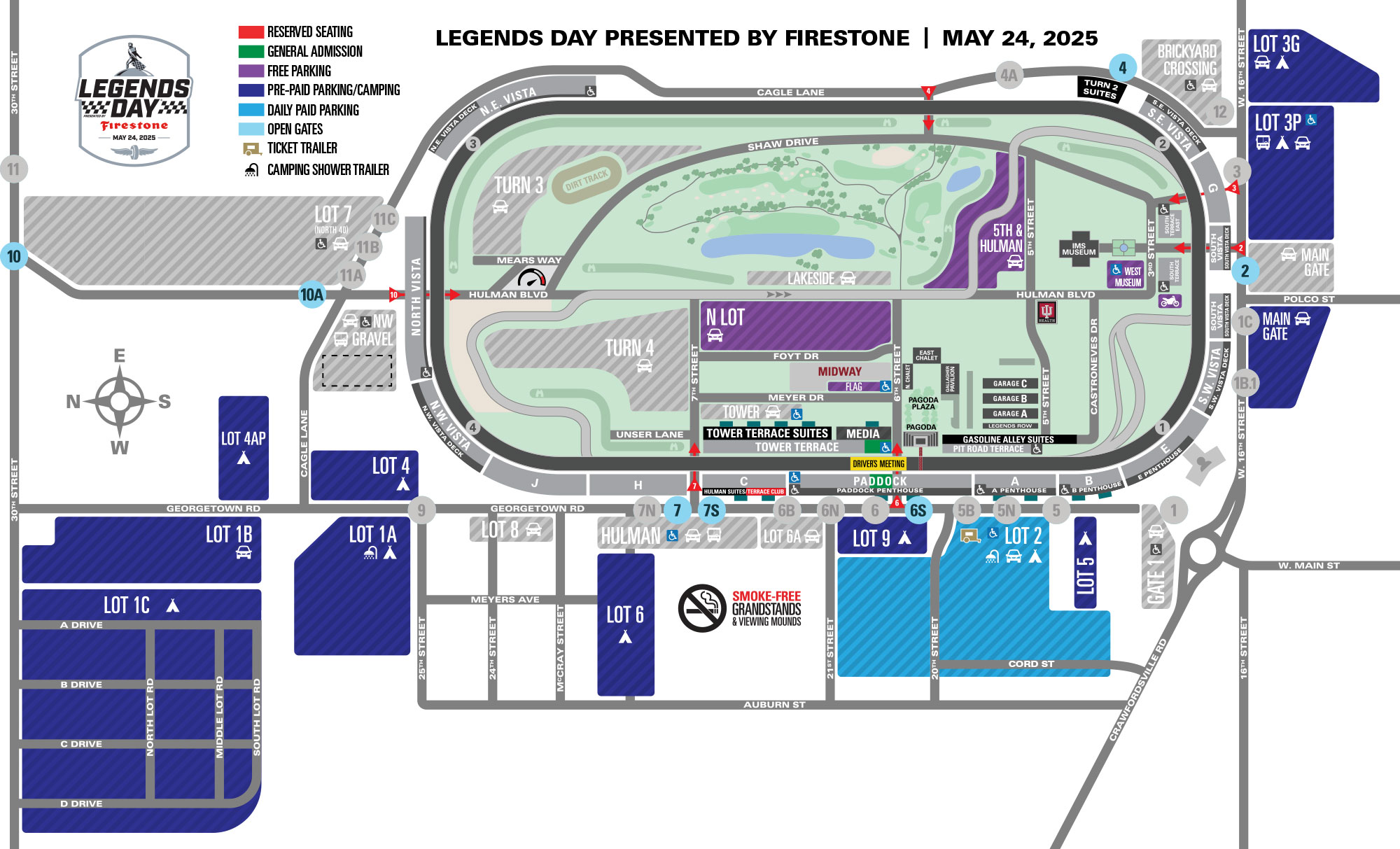 Free parking for Legends Day located in the IMS infield. Enter through Gate 2 from 16th Street.