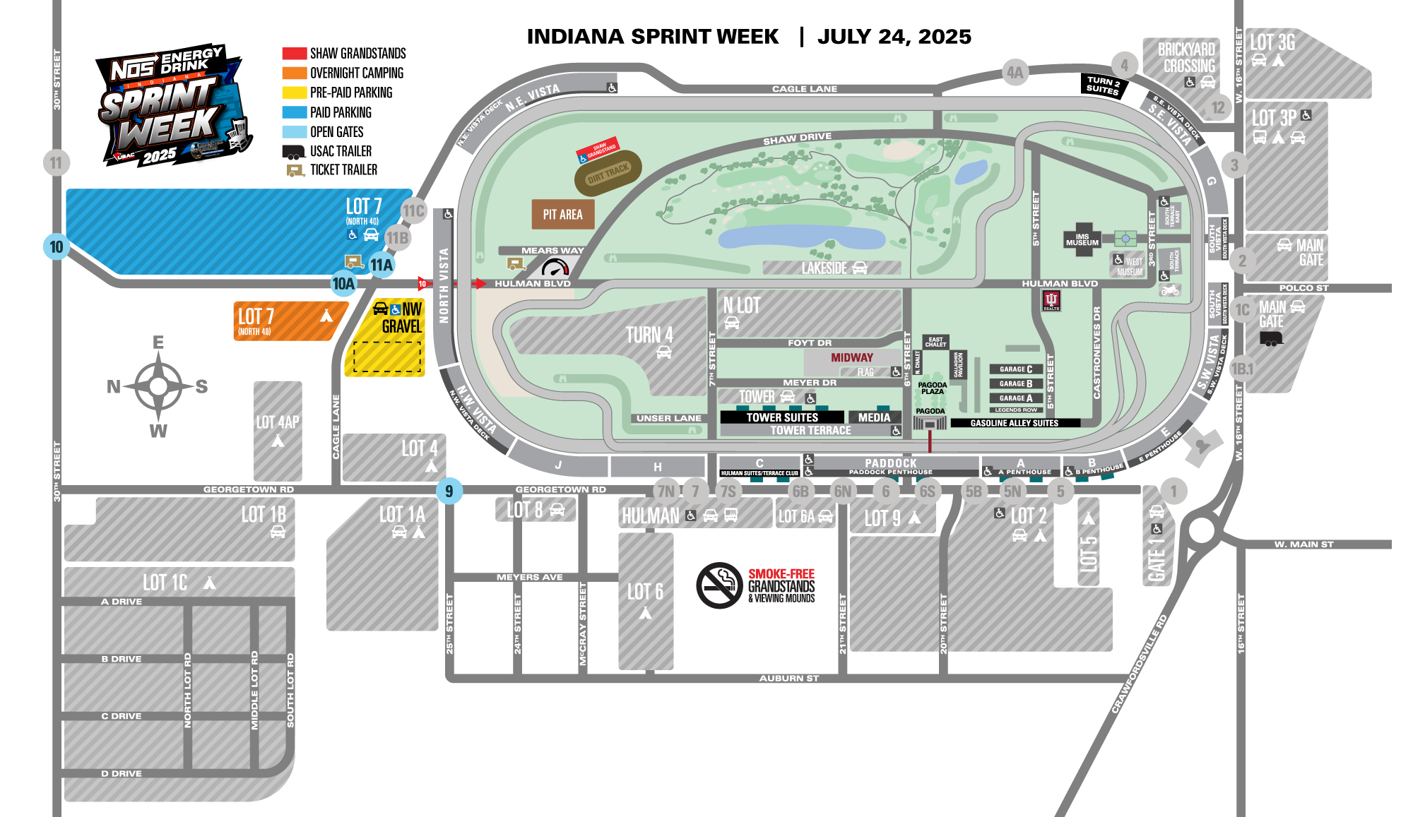 Premium daily auto parking is also available in the Northwest Gravel lot and can be purchased on IMS.com or the IMS Ticket Office. Parking is also available on site for $30 on Thursday, July 24. Access the Northwest Gravel lot via 30th St. (Gate 10); parking is just north of the IMS oval, and closer to Tunnel 10 access.